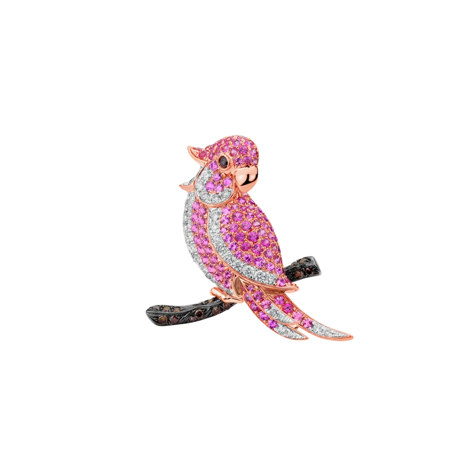 Exkluzivní brož v 18kt růžovém a černém zlatě s černým a hnědým diamantem a safírem pink, je dokonalým symbolem elegance a luxusu. Její precizní zpracování a nádherný lesk vás okouzlí na první pohled. Šperk je součástí kolekce Animals.