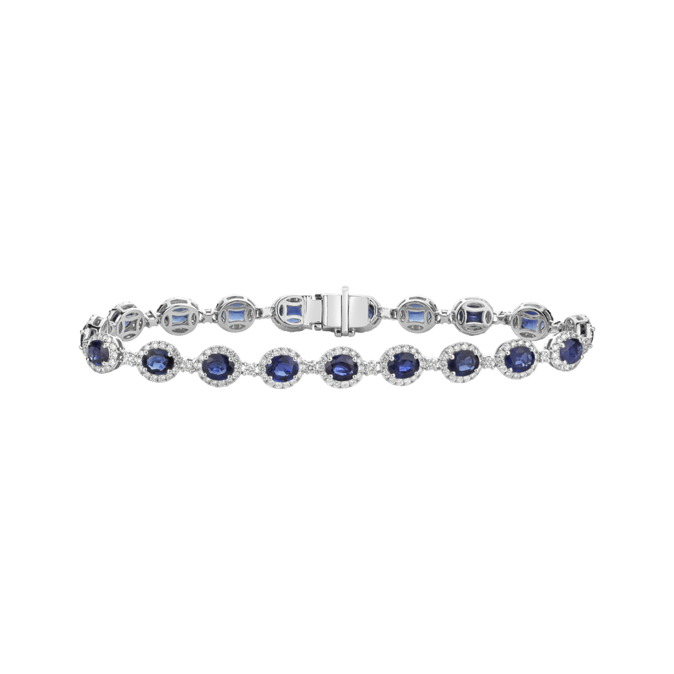 Nádherný náramek z 14kt bílého zlata s lesklými diamanty a safírem - zářící klenot, který zdůrazňuje luxus a noblesu. Šperk je součástí kolekce Royal.