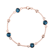 Elegantní náramek s jemnou řetízkovou siluetou z růžového zlata, která rafinovaně propojuje noblesní detaily v podobě nebesky modrých topazů a efektně broušených diamantů.