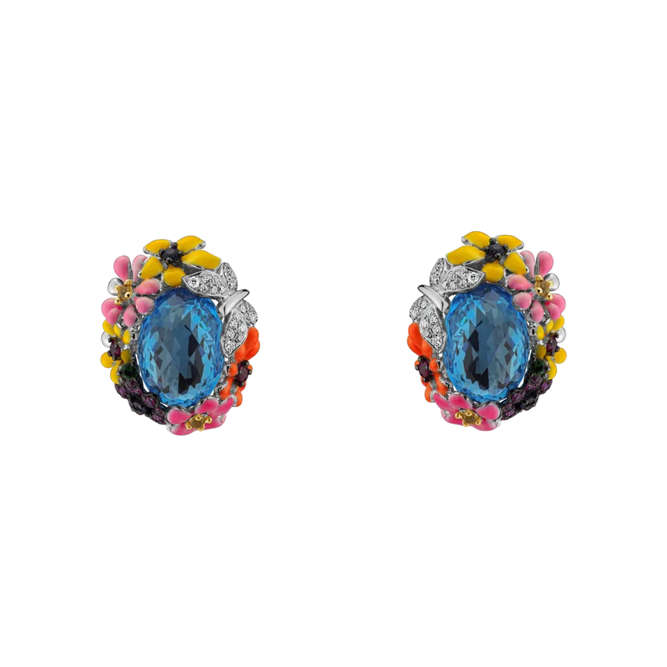 Elegantní náušnice s 18kt bílým zlatem zdobené diamantem, topazem swiss a drahokamy. Dokonalý doplněk pro každou příležitost k úspěchu. Šperk je součástí kolekce Flowers.