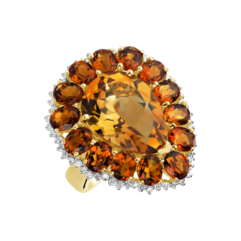 Tento prsten z 18kt žlutého a bílého zlata s diamanty a citrínem madeira, je svědectvím hlubokých citů a unikátního stylu, který vás nikdy nezradí. Jeho nadčasový design a luxusní krása z něj činí nejen elegantní šperk, ale i věrného společníka na cestě vašeho života. Šperk je součástí kolekce Fantasy.