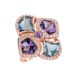 Prsten z 18kt růžového zlata s diamanty a drahokamy je vrcholným projevem elegance a nadčasovosti. Jeho nádherný design a precizně vložené drahokamy odrážejí světlo tvořící jedinečný efekt, který oslavuje krásu a sofistikovanost nositelky. Šperk je součástí kolekce Blossoms.