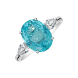 Klasický design zásnubního prstenu v moderním provedení. Oválná centrální paraiba je po stranách zdobena dvěma menšími diamanty, což vypadá opravdu úchvatně.