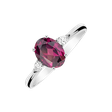 Klasický design zásnubního prstenu v moderním provedení. Oválný centrální rhodolit je po stranách zdoben dvěma menšími diamanty, což vypadá opravdu úchvatně.