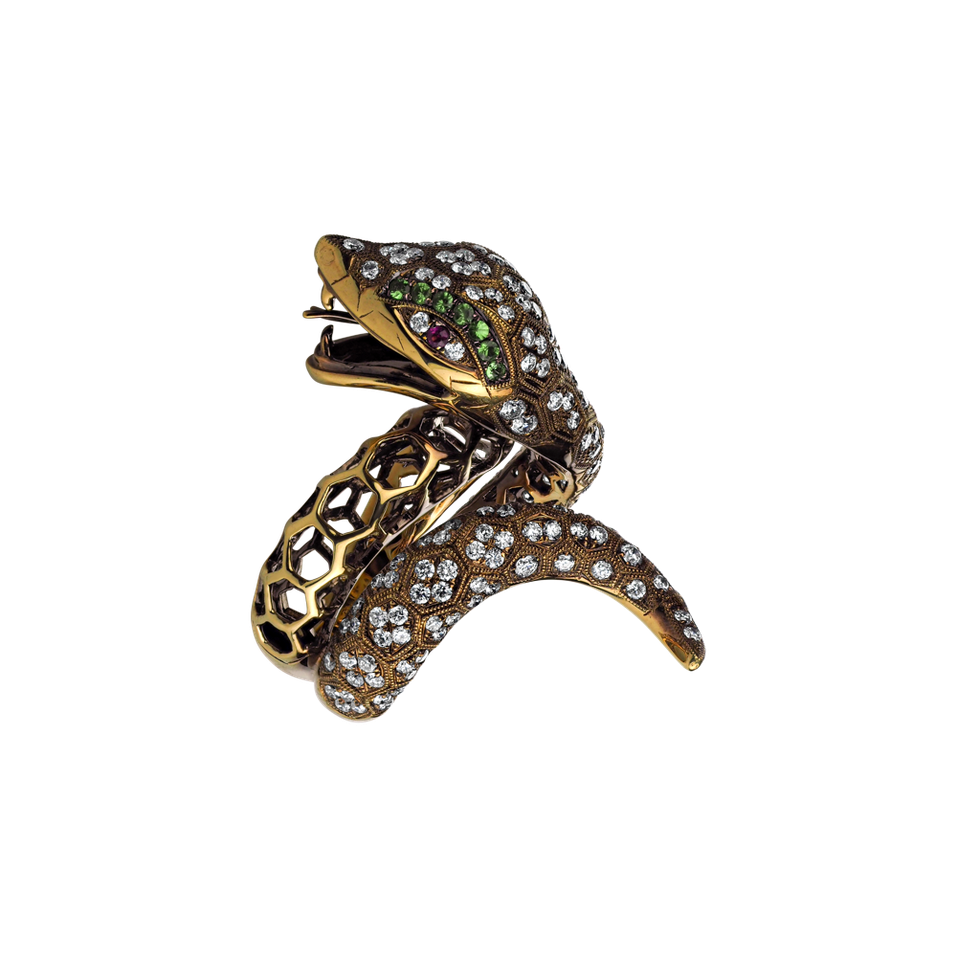 Prsten z 18kt zlata s diamantem, rubínem a granátem green je mistrovským dílem ruční práce a ozdobou pro ty, kteří znají hodnotu pravé krásy a síly. Šperk je součástí kolekce Animals.