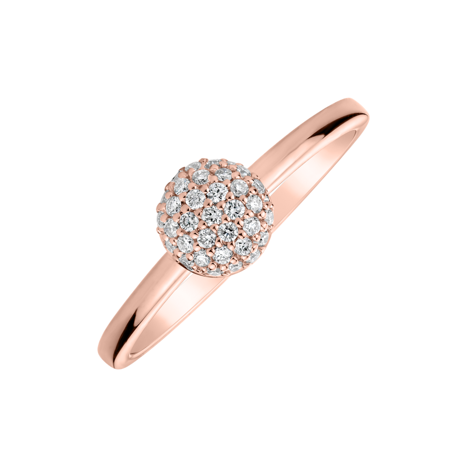 Tento prsten vyroben z 14kt růžového zlata, zdobený diamanty, je dokonalým symbolem jemné elegance. Jeho světelný třpyt a souhra barev dodávají každému dni kapku luxusu. Šperk je součástí kolekce Charming.
