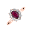 Snoubení 14kt růžového zlata, diamantů a rubínu v tomto prstenu vytváří odvážnou symbiózu, která je odrazem silné osobnosti a sebevědomé elegance. Luxusní šperky jako tyto nejenže zdůrazní vaši výjimečnost, ale také přinesou do vašeho života neopakovatelný nádech exkluzivity a noblesy, který si zasloužíte. Šperk je součástí kolekce Diana.