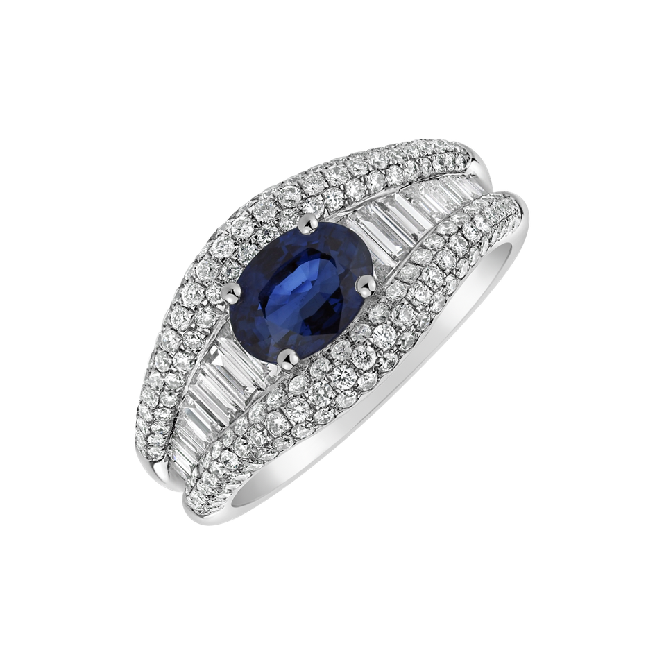 Skvěle vyladěný prsten z 18kt bílého zlata, zdobený brilantními diamanty a hlubokým safírem, je slavnostním vyjádřením hloubky vašich citů a honosným znamením vašeho vkusu. Šperk je součástí kolekce Glamour Edge.
