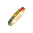 Prsten Gradient Harmony je ozdobený safíry v postupně přecházejících barvách, od tmavě zelené přes žluté, oranžové až po červené odstíny. Kameny jsou zasazeny do zlatého kroužku, což dodává prstenu elegantní a výrazný vzhled.